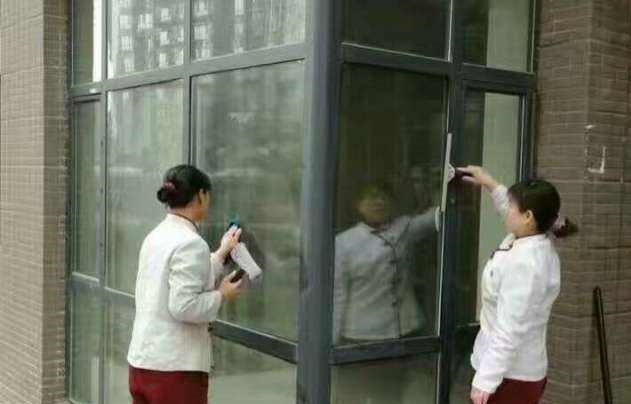 6、对大厅玻璃门窗上的浮尘,指印和脏渍进行擦拭,使之明亮干净。